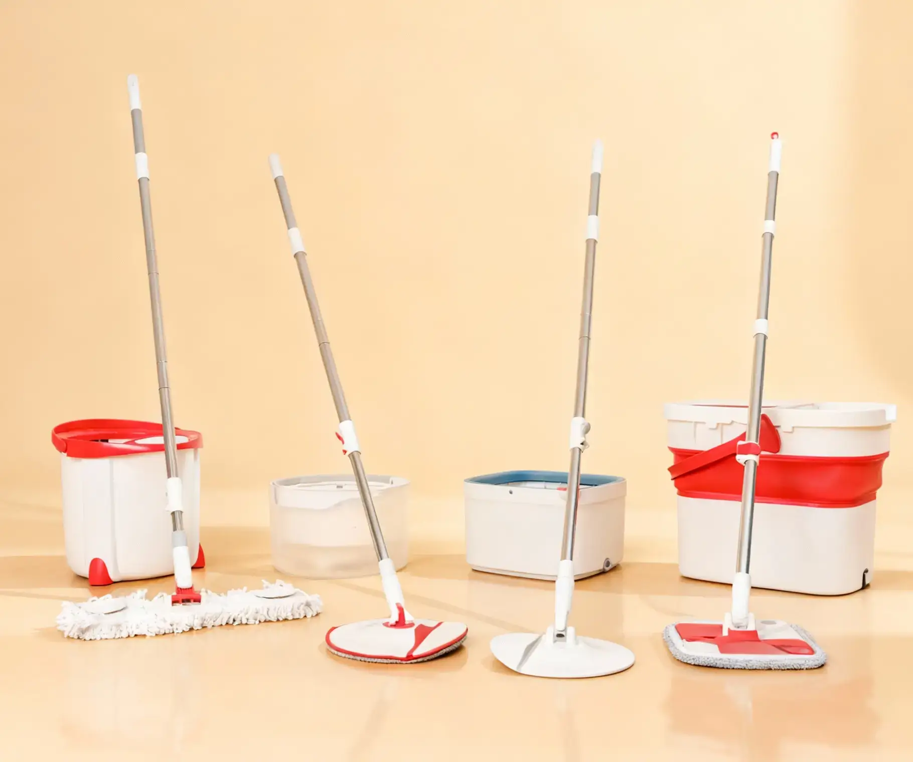 Customize mop fiber blend, GSM, head size, and attachment (Velcro, pocket, clamp). Define bucket capacity, color, wheelbase, and wringer type. Choose stainless or aluminum spin baskets, and set handle length and wall thickness. We support retail color boxes, sleeve cards, set packs, and bulk cartons.